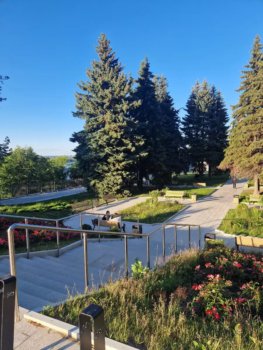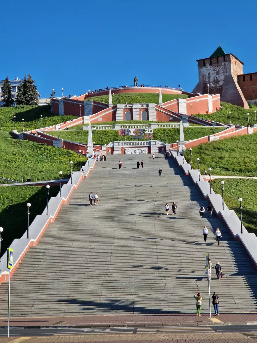 Зато не смогли пропустить Чкаловскую лестницу — одно из самых масштабных сооружений города. Её 560 ступенек поднимаются вверх по склону, открывая головокружительный вид на Волгу и окрестности.