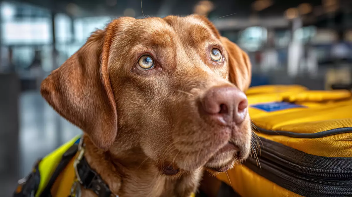 Лабрадор спокойно прохаживается рядом с очередью на таможенный контроль и в этот момент анализирует химический состав краски на купюрах в кошельках пассажиров.