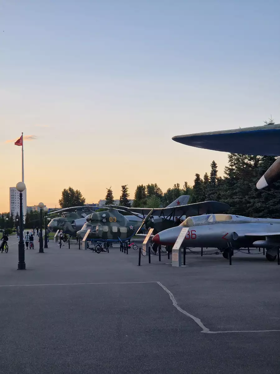 В парке очень много военных экспонатов - самолеты, вертолеты, танки и т.д.
