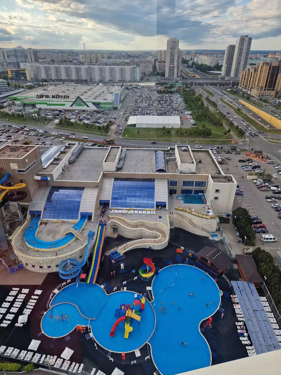 Рядом с колесом гостиница и аквапарк с большой парковкой, на которой можно оставить автомобиль.