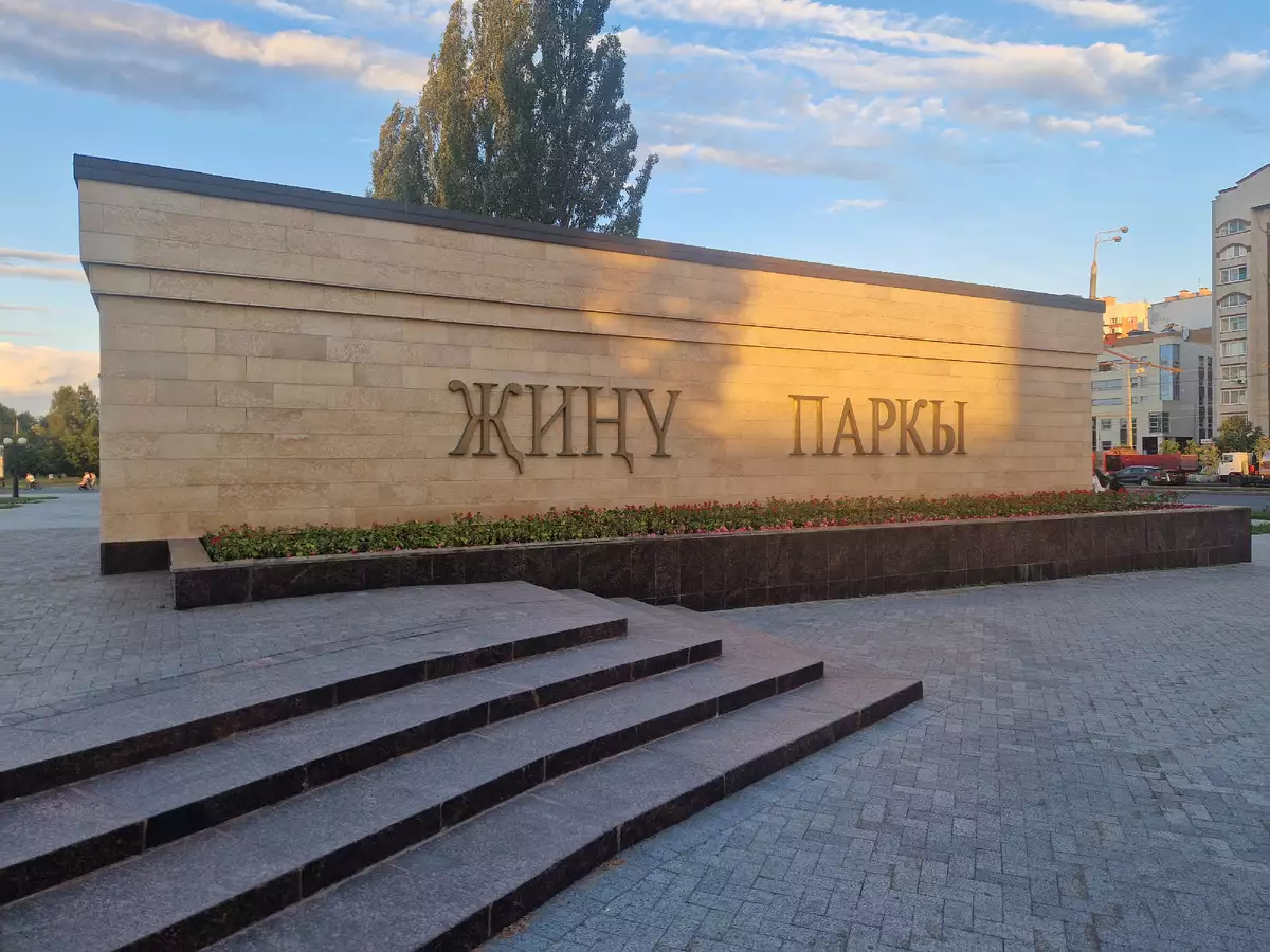 И перед нами вход в парк Тысячелетия - одна из самых популярных зон отдыха казанцев. Здесь можно прокатиться на велосипедах, покататься на роликах и просто насладиться природой. Правда деревьев высоких почти нет.