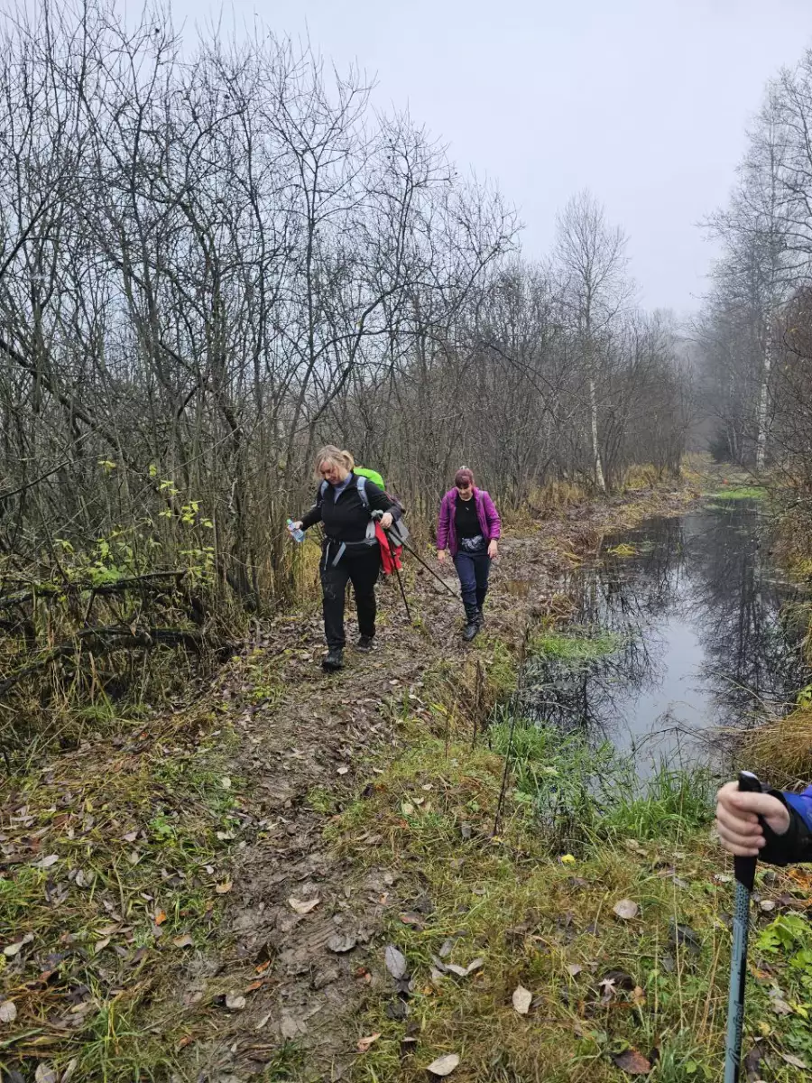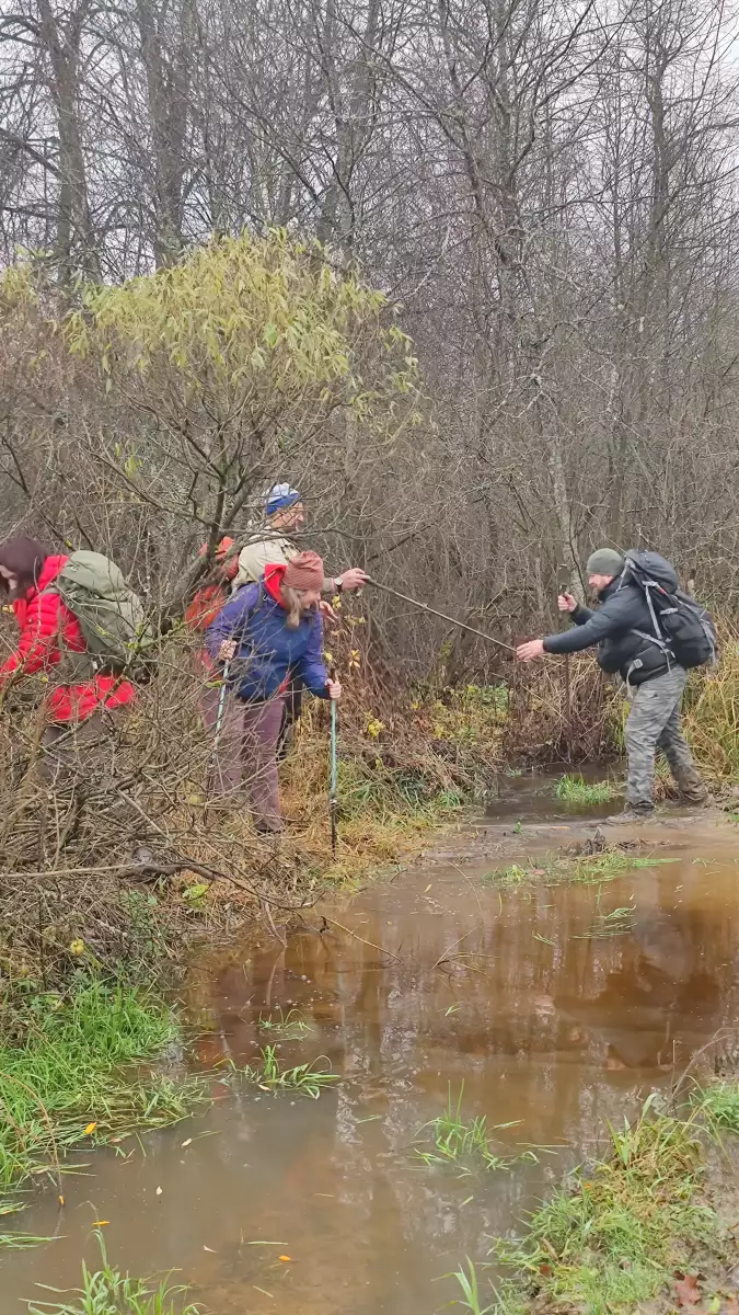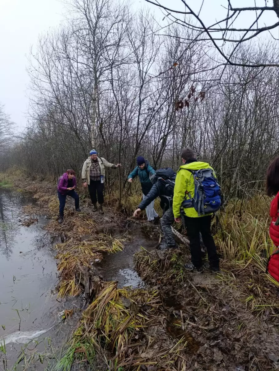 Наш отряд — племя Шиложопых во главе с неутомимым Дмитрий Немцев — шёл напролом: лужи по колено, осенняя грязь, и никакие природные препятствия нас не остановили. Даже охотники, расположившиеся вдоль тракта через километр друг от друга, не смогли нас сбить с пути. Они, судя по всему, ожидали лося или кабана, а получили группу туристов с термосами и отличным настроением — не самый ожидаемый трофей, но тоже повод для удивления. Попытки заставить нас свернуть с маршрута — включая риск случайной пули — только прибавляли решимости; мы это воспринимали как дополнительную мотивацию двигаться дальше.