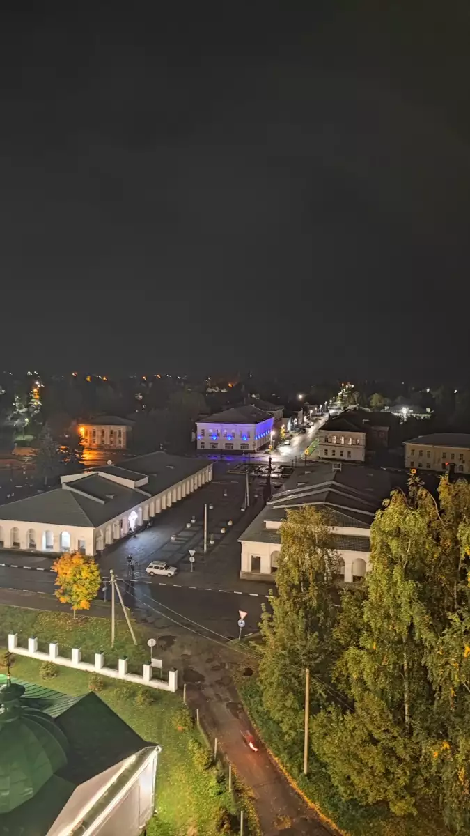 Осенним вечером, когда темнеет аж слишком рано, по дороге из Череповца в Рыбинск я решила не пролететь мимо Пошехонья ради одной конкретной штуки — колокольни собора Рождества Христова. На Яндекс‑картах народ обещал смотровую с красавым видом на город и разлив реки. Но честно — после шести часов я уже почти перестала в это верить.