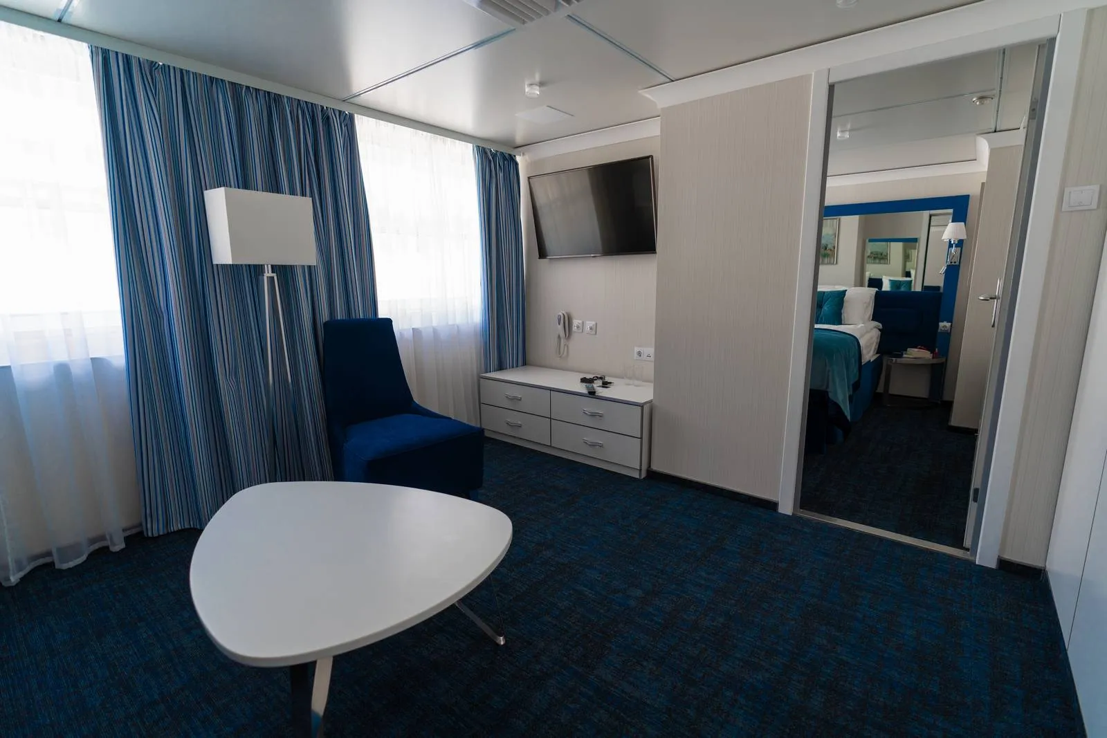 Просторная двухкомнатная каюта, оснащенная всем необходимым для комфортного отдыха. Оборудована большими обзорными открывающимися окнами. Дети до 14 лет включительно бесплатно (с оплатой питания 3000 руб. в сутки).