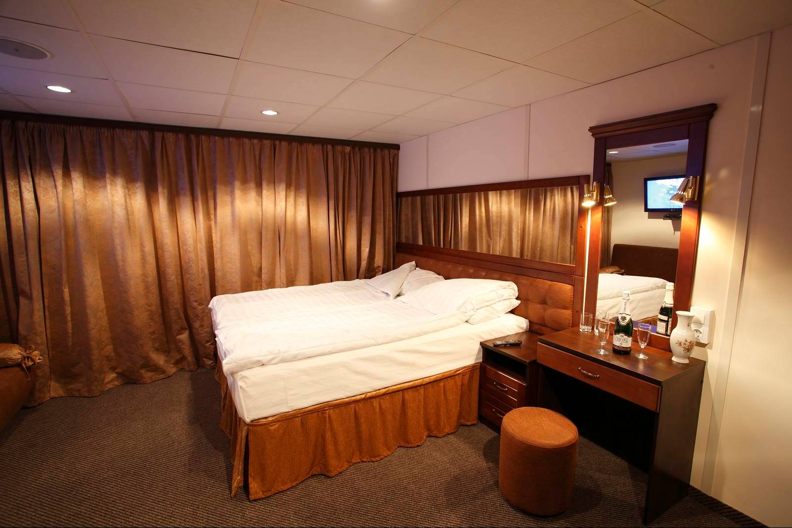 102 уютные каюты классов «стандарт», «стандарт премиум» и «люкс», оборудованные климат-контролем, телевизорами, радио, сейфами, бесплатным wi-fi и другими удобствами, способны принять 208 пассажиров. На борту гости могут найти два уютных ресторана, три бара, один из которых имеет панорамный обзор, сувенирный магазин, лаундж-зону для чтения, танцплощадку, салон красоты, сауну и открытый солярий, расположенный на солнечной палубе.