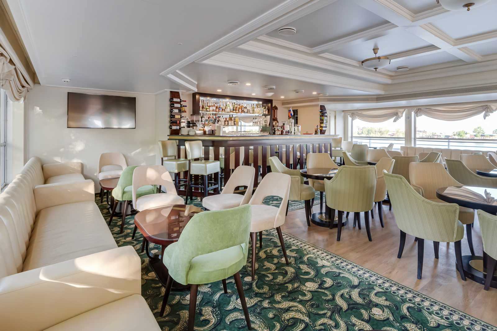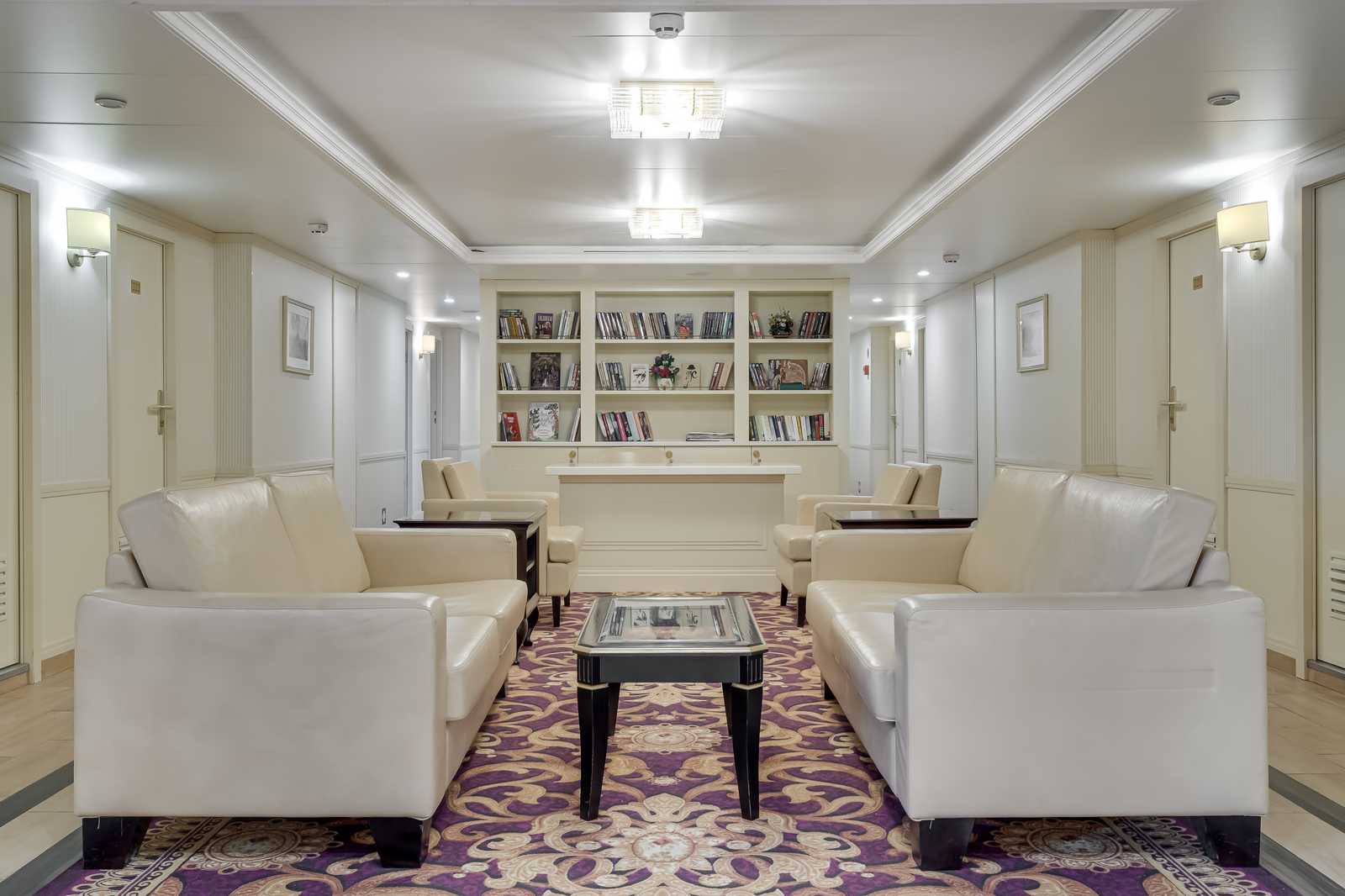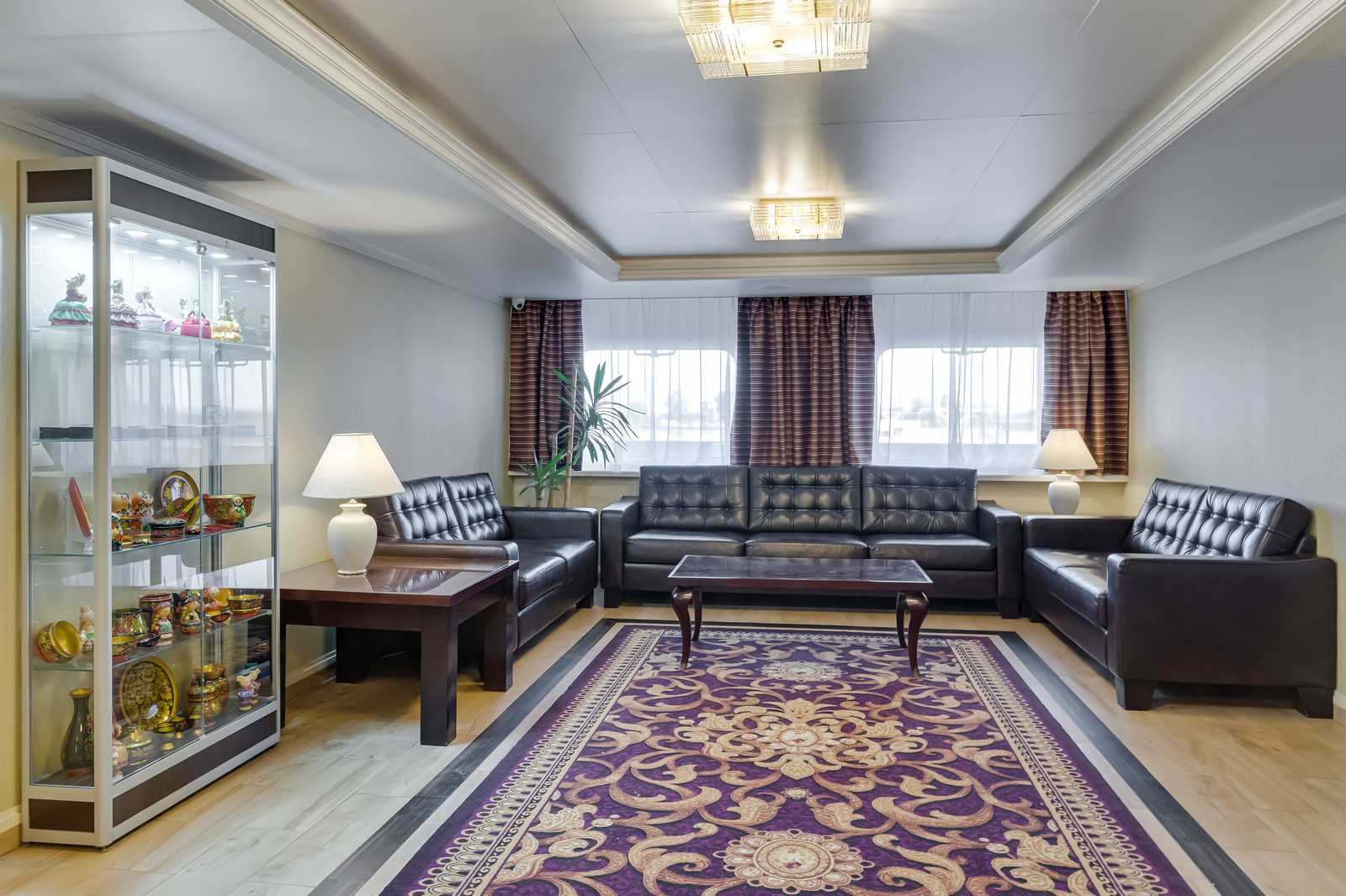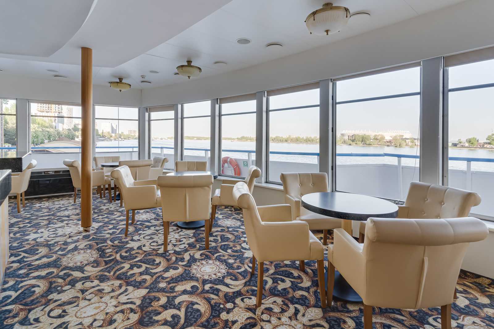 Теплоход готов взять на борт 182 пассажира и разместить в 91 каюте. Основу номерного фонда составляют каюты люкс и полулюкс. Это комнаты площадью 15 м2, у каждой — выход на индивидуальный балкон. Ещё доступны расширенные номера на 30 м2 с панорамным остеклением или каюты комфорт-класса с обзорным окном. Независимо от уровня, все номера светлые, с аккуратной мебелью и текстилем, оснащены отдельным санблоком, кондиционером, холодильником и другими удобствами.