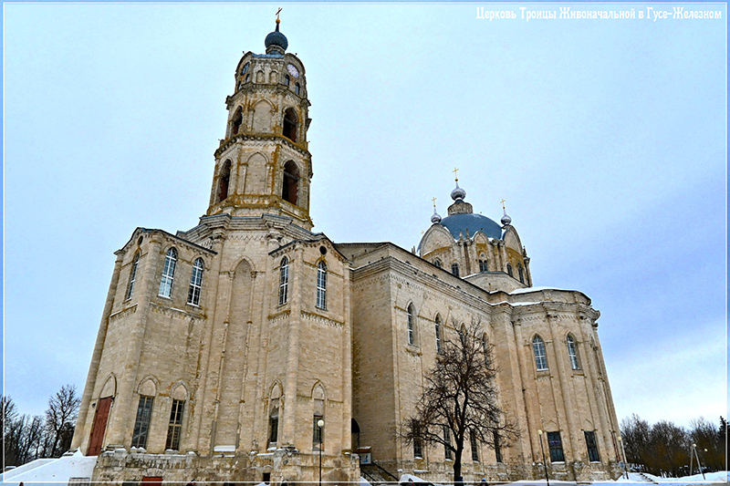 Осмотр Храма Живоначальной Троицы. Этот необычный храм, который в народе называют Норт-Дам-де-Гусь, является самым большим сельским храмом России. Построенный в стиле псевдоготики, он имеет 70-метровую колокольню, а весь образ резко контрастирует с местными одноэтажными домиками провинциальной лесной деревни.